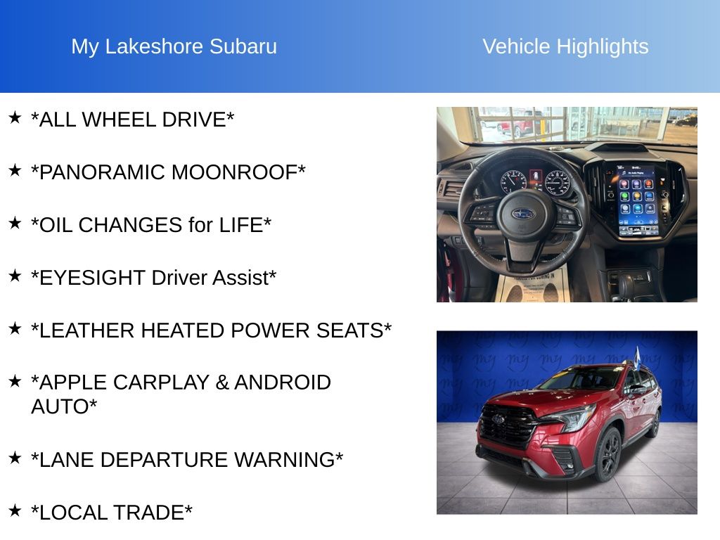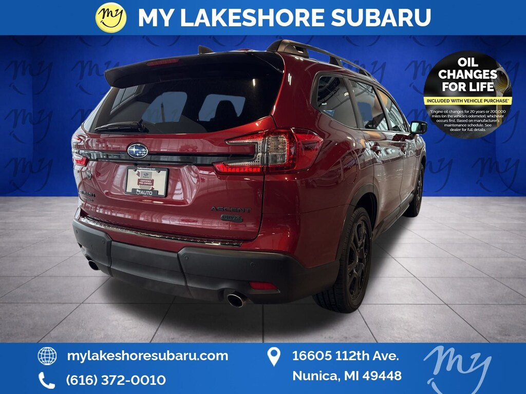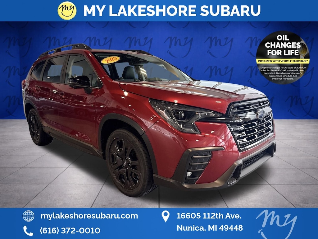 Ascent Onyx Edition, Crimson Red Pearl, *ALL WHEEL DRIVE*, *APPLE CARPLAY & ANDROID AUTO*, *EYESIGHT Driver Assist*, *LANE DEPARTURE WARNING*, *LEATHER HEATED POWER SEATS*, *LOCAL TRADE*, *OIL CHANGES for LIFE*, *PANORAMIC MOONROOF*. Certified. Crimson Red Pearl 2023 Subaru Ascent Onyx Edition AWD Lineartronic CVT 2.4L 4-Cylinder DOHC 16V