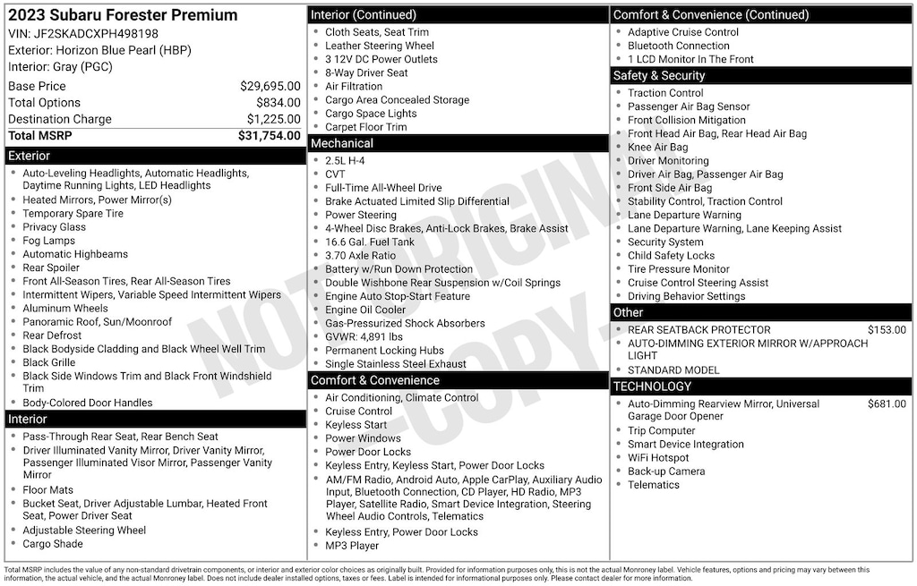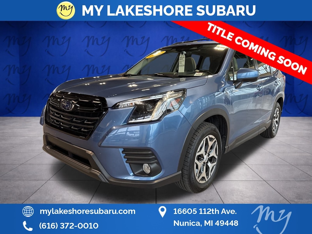 Forester Premium, Horizon Blue Pearl, *ALL WHEEL DRIVE*, *APPLE CARPLAY & ANDROID AUTO*, *BACKUP CAMERA*, *EYESIGHT Driver Assist*, *HEATED SEATS*, *LANE DEPARTURE WARNING*, *LOCAL TRADE*, *OIL CHANGES for LIFE*, *PANORAMIC MOONROOF*. Certified. Horizon Blue Pearl 2023 Subaru Forester Premium AWD Lineartronic CVT 2.5L 4-Cylinder DOHC 16V