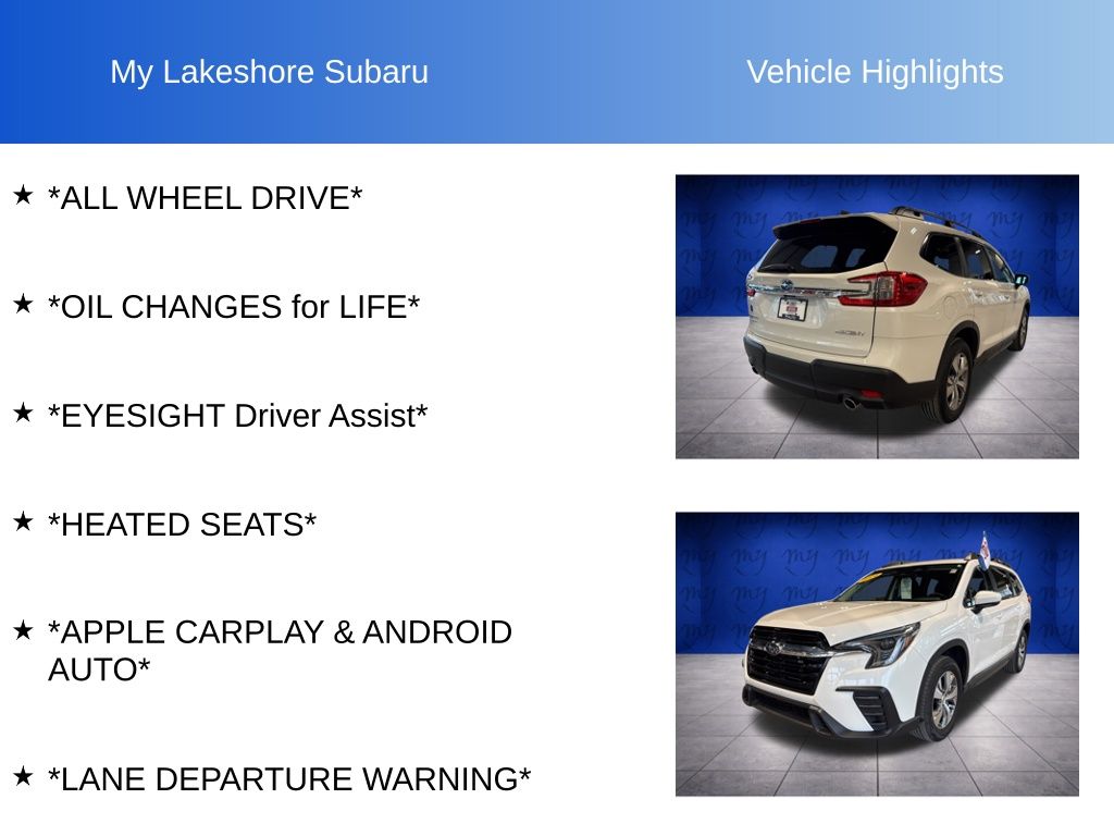 Ascent Premium, Crystal White Pearl, *ALL WHEEL DRIVE*, *APPLE CARPLAY & ANDROID AUTO*, *EYESIGHT Driver Assist*, *HEATED SEATS*, *LANE DEPARTURE WARNING*, *OIL CHANGES for LIFE*. Certified. Crystal White Pearl 2024 Subaru Ascent Premium AWD Lineartronic CVT 2.4L 4-Cylinder DOHC 16V