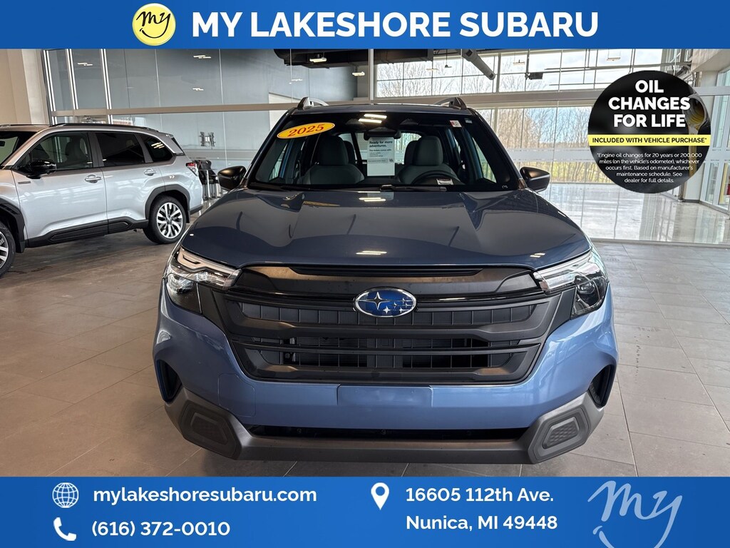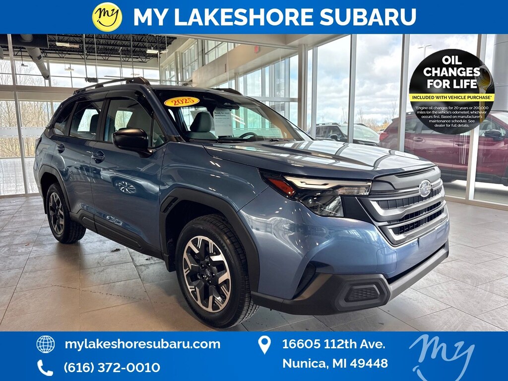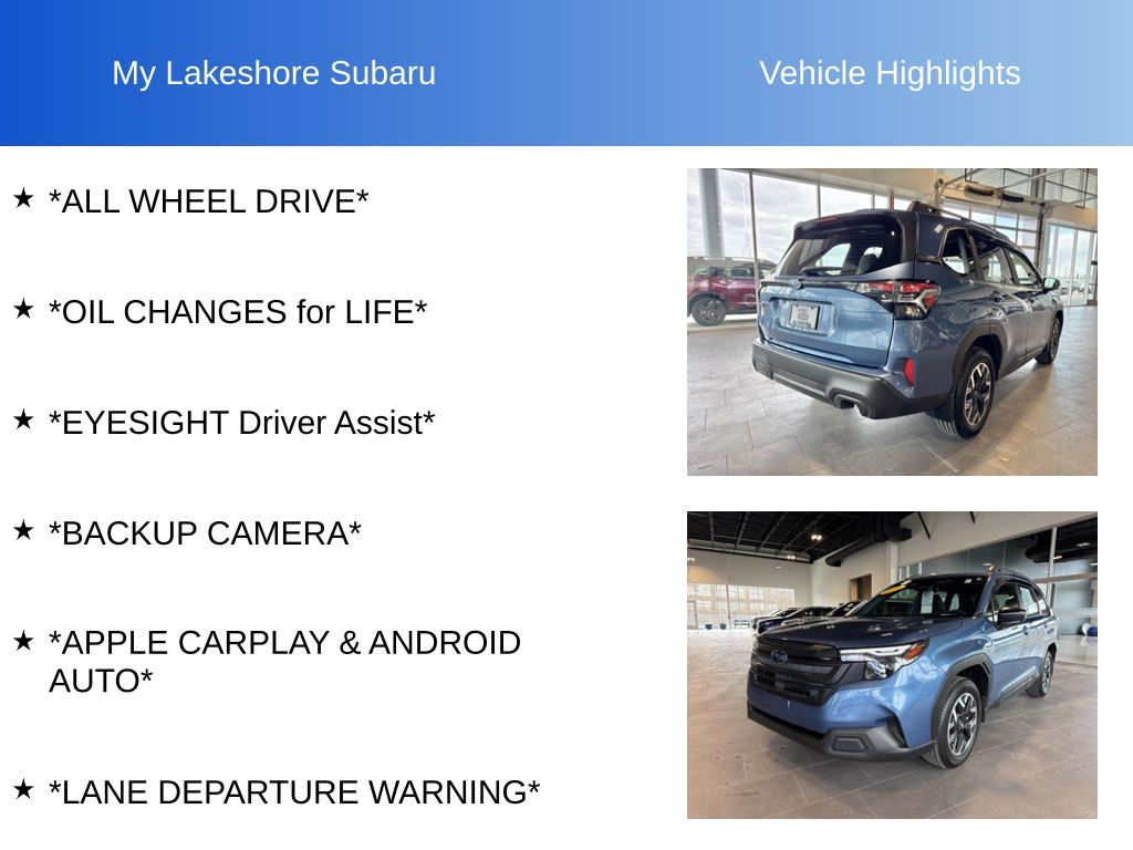 Horizon Blue Pearl, *ALL WHEEL DRIVE*, *APPLE CARPLAY & ANDROID AUTO*, *BACKUP CAMERA*, *EYESIGHT Driver Assist*, *LANE DEPARTURE WARNING*, *OIL CHANGES for LIFE*. Certified. Horizon Blue Pearl 2025 Subaru Forester AWD Lineartronic CVT 2.5L 4-Cylinder DOHC 16V