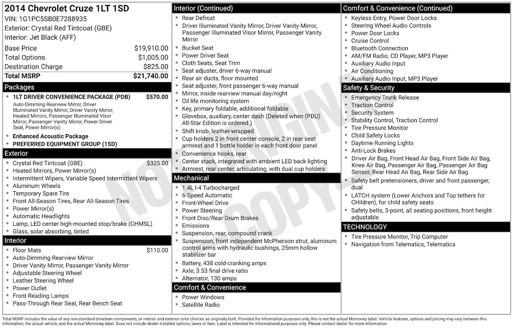 Crystal Red Tintcoat 2014 Chevrolet Cruze 1LT FWD 6-Speed Automatic Electronic with Overdrive ECOTEC 1.4L I4 SMPI DOHC Turbocharged VVT