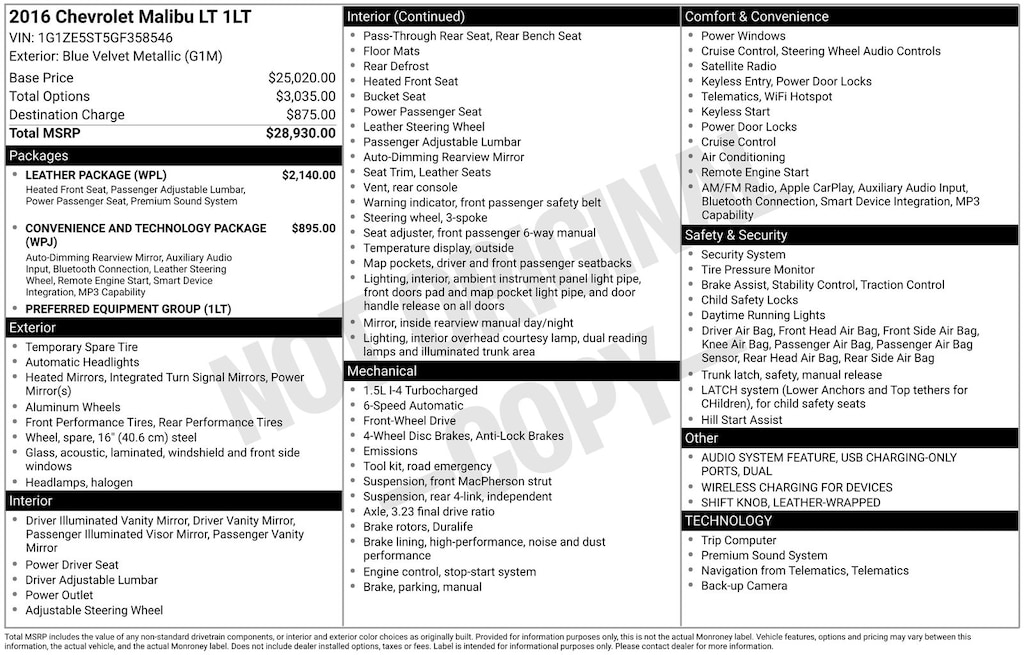 Malibu LT 1LT, Blue Velvet Metallic, Jet Black w/Leather Appointed Seat Trim, *LOCAL TRADE*, 120-Volt Power Outlet, 3-Spoke Leather-Wrapped Steering Wheel, 6-Way Power Front Passenger Seat Adjuster, AM/FM Stereo w/Seek & Scan/Digital Clock, Bose Premium 9-Speaker System, Convenience & Technology Package, Driver Information System w/Color Display, Front Passenger Power Lumbar Seat Adjuster, Heated Driver & Front Passenger Seats, Inside Rear-View Auto-Dimming Mirror, Leather Appointed Seat Trim, Leather Package, Leather Wrapped Shift Knob, Preferred Equipment Group 1LT, Remote Vehicle Starter System, Teen Driver, USB Charging Port in Console, Wireless Charging For Devices. Blue Velvet Metallic 2016 Chevrolet Malibu LT 1LT FWD 6-Speed Automatic 1.5L DOHC