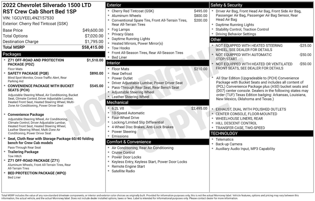 Silverado 1500 LTD RST, Cherry Red Tintcoat, *APPLE CARPLAY & ANDROID AUTO*, *LOCAL TRADE*, *OIL CHANGES for LIFE*, All-Weather Floor Liner (LPO) (AAK), Bed Protection Package, Chevytec Spray-On Black Bedliner, Dual Exhaust w/Polished Outlets, Heavy-Duty Air Filter, Hill Descent Control, Lane Change Alert w/Side Blind Zone Alert, Off-Road Suspension, Perimeter Lighting, Rear Cross Traffic Alert, Rear Wheelhouse Liners, Safety Package, Ultrasonic Front & Rear Park Assist, Z71 Off-Road & Protection Package, Z71 Off-Road Package. Cherry Red Tintcoat 2022 Chevrolet Silverado 1500 LTD RST 4WD 10-Speed Automatic EcoTec3 6.2L V8