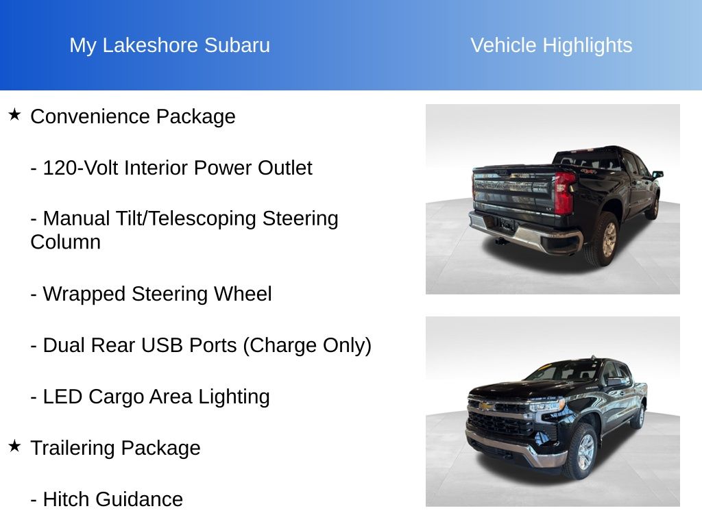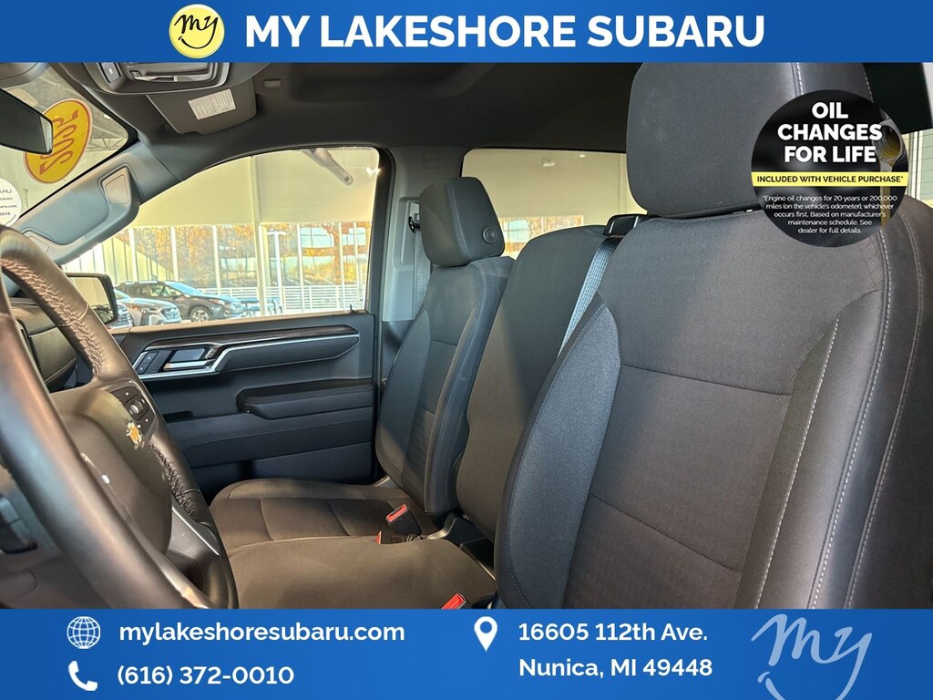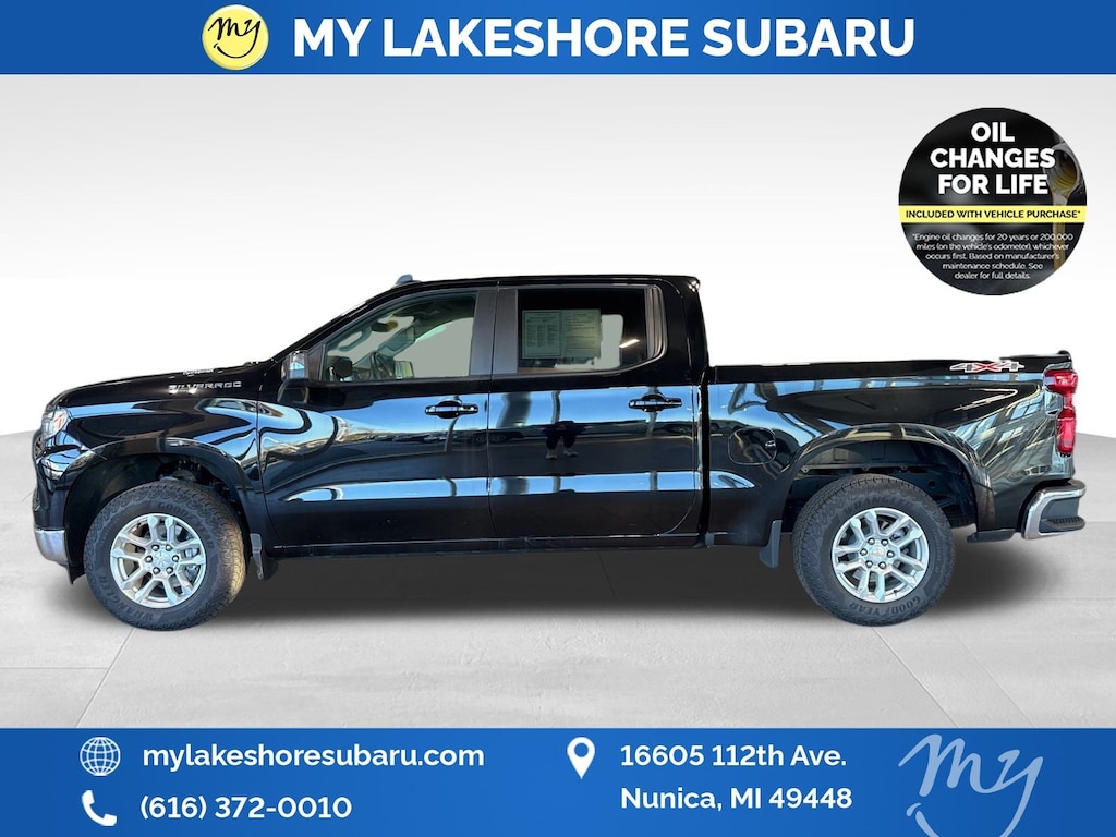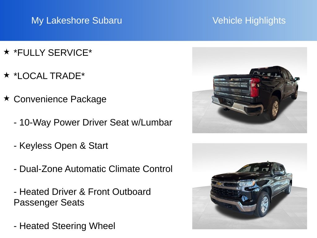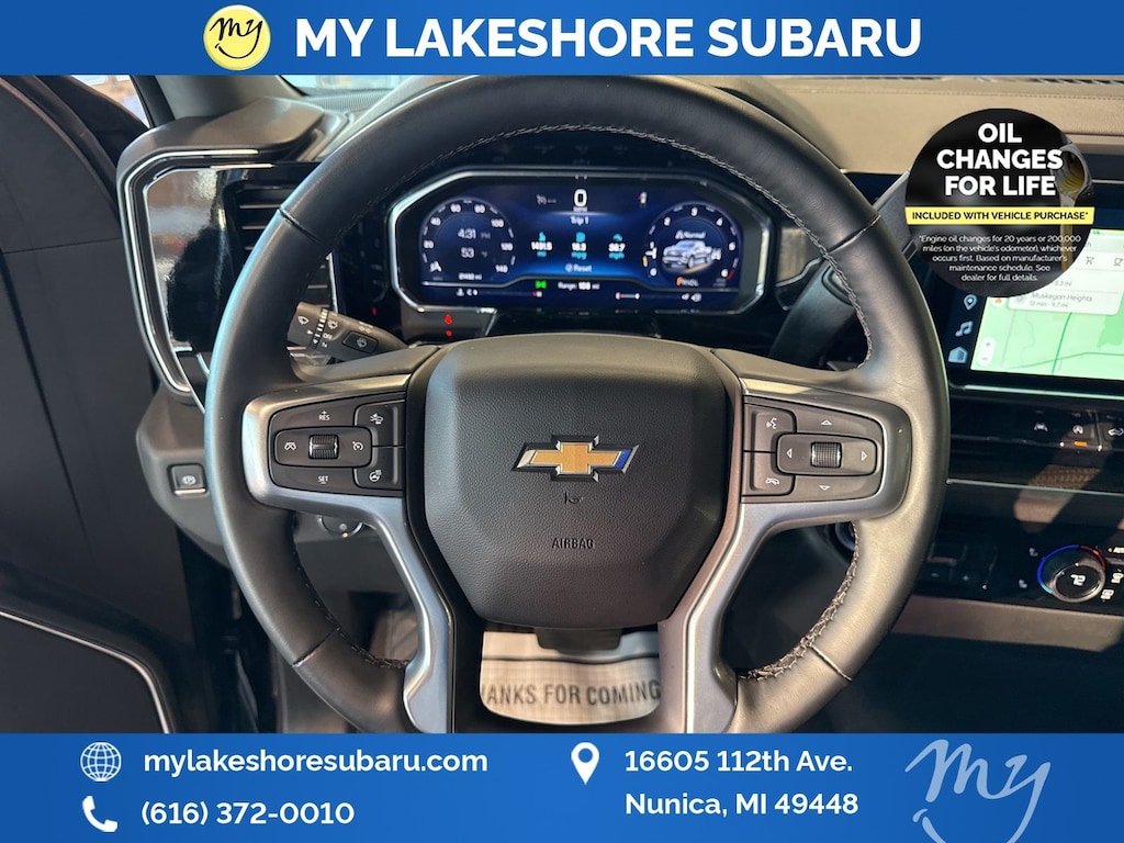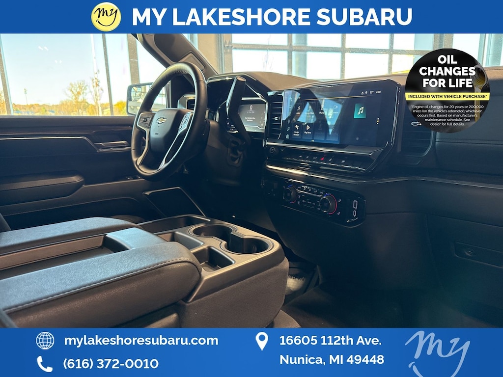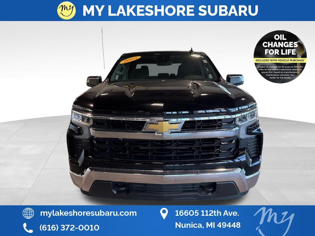 Silverado 1500 LT, 2.7L I4 Turbocharged DOHC 16V LEV3-SULEV30 310hp, Black, *ADAPTIVE CRUISE*, *APPLE CARPLAY & ANDROID AUTO*, *FULLY SERVICE*, *HEATED SEATS*, *HEATED STEERING WHEEL*, *LANE DEPARTURE WARNING*, *LOCAL TRADE*, *OIL CHANGES for LIFE*, *REARVIEW CAMERA*, *REMOTE START*, 10-Way Power Driver Seat w/Lumbar, 120-Volt Bed Mounted Power Outlet, 120-Volt Interior Power Outlet, Convenience Package, Dual Rear USB Ports (Charge Only), Dual-Zone Automatic Climate Control, Heated Driver & Front Outboard Passenger Seats, Heated Steering Wheel, Hitch Guidance, Keyless Open & Start, LED Cargo Area Lighting, Manual Tilt/Telescoping Steering Column, Trailering Package, Wrapped Steering Wheel. Black 2025 Chevrolet Silverado 1500 LT 4WD 8-Speed Automatic 2.7L I4 Turbocharged DOHC 16V LEV3-SULEV30 310hp