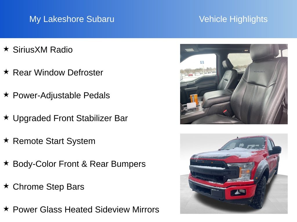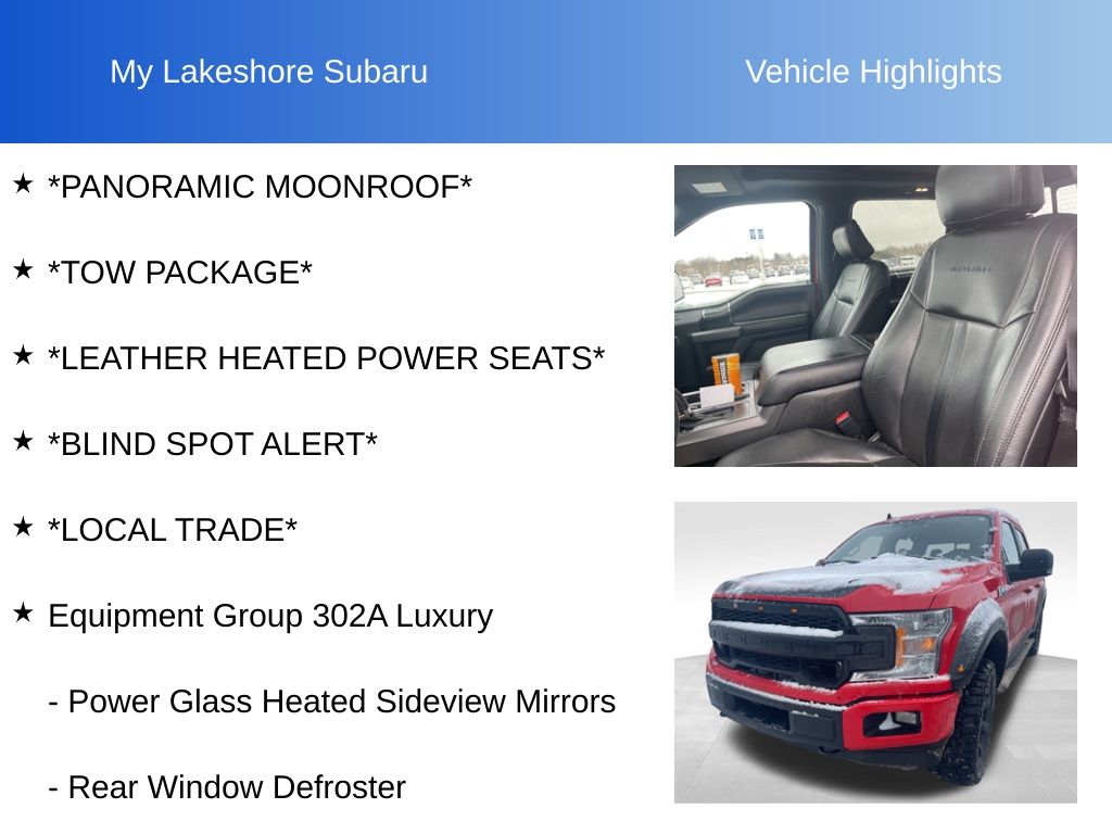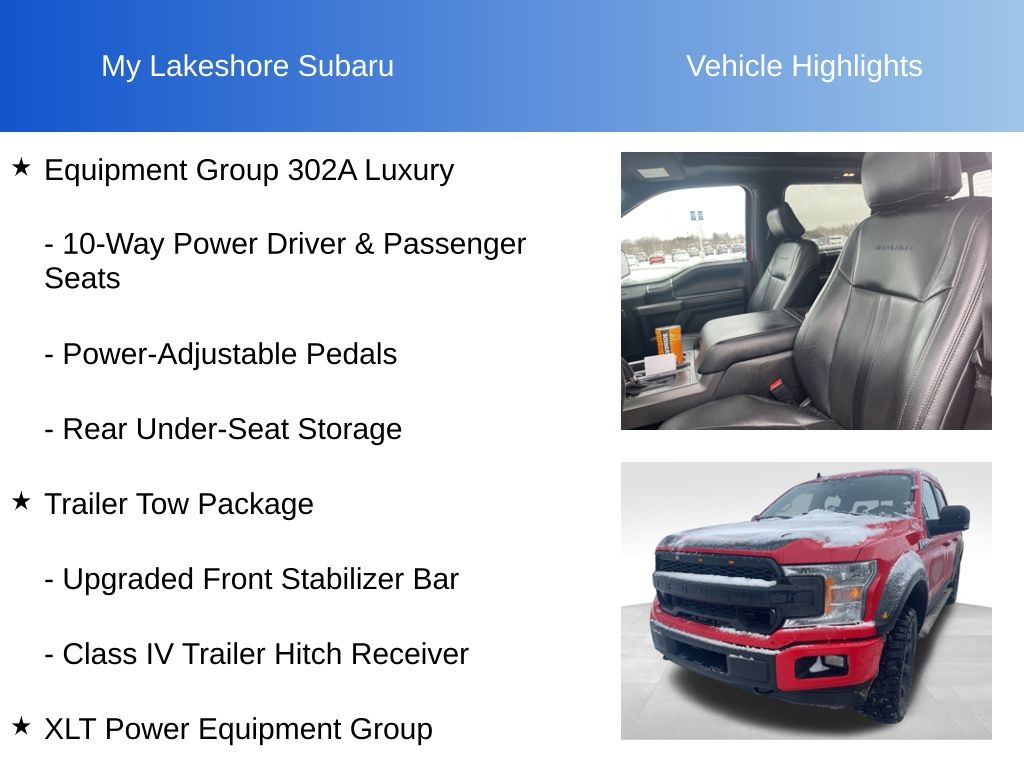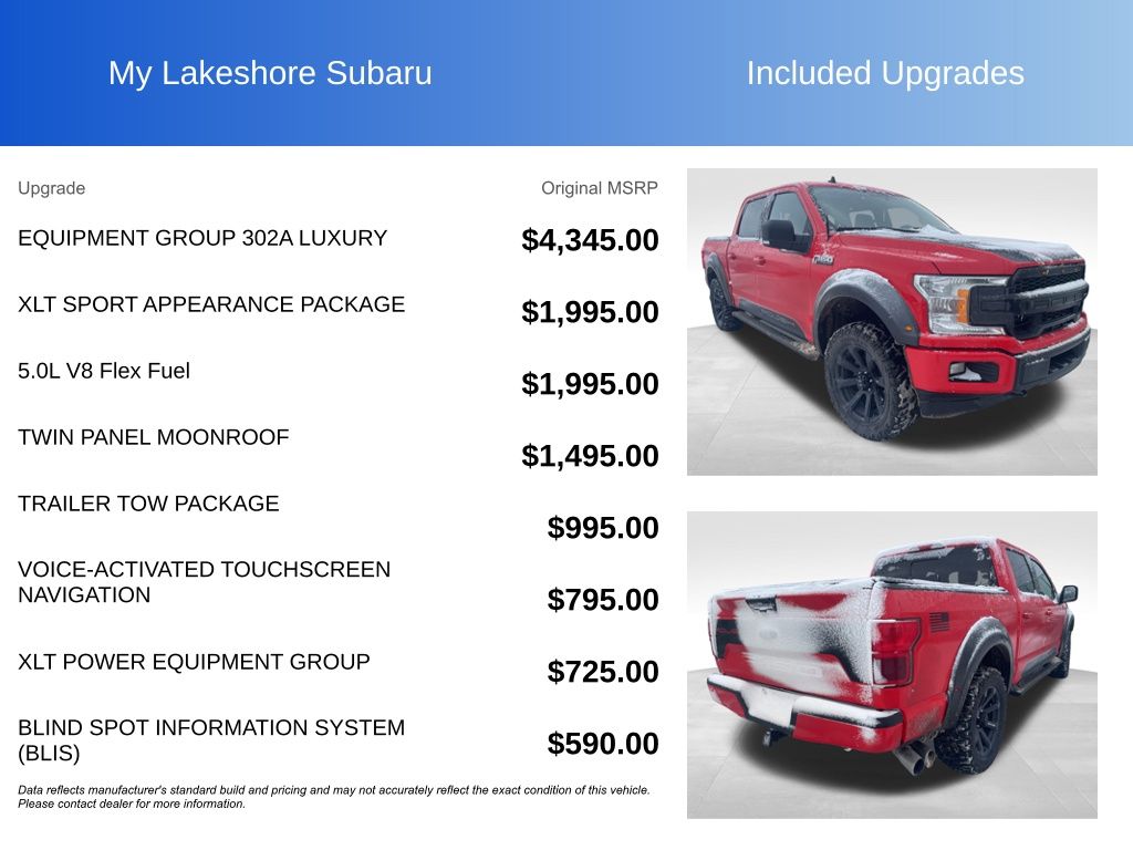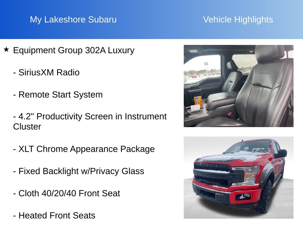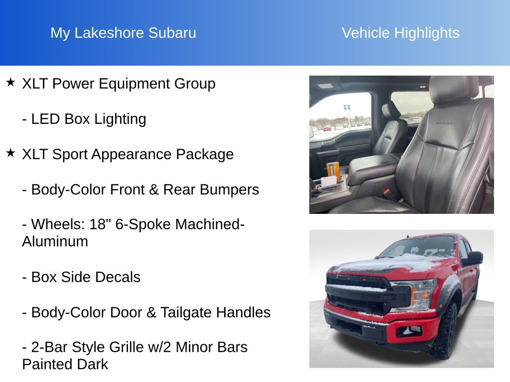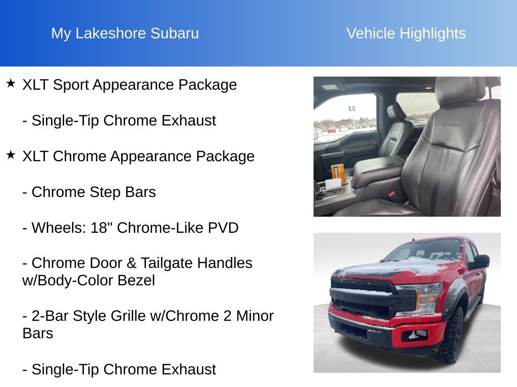 F-150 XLT, 5.0L V8, Race Red, *BLIND SPOT ALERT*, *LEATHER HEATED POWER SEATS*, *LOCAL TRADE*, *PANORAMIC MOONROOF*, *TOW PACKAGE*, 10-Way Power Driver & Passenger Seats, 2-Bar Style Grille w/2 Minor Bars Painted Dark, 2-Bar Style Grille w/Chrome 2 Minor Bars, 4.2" Productivity Screen in Instrument Cluster, Accent-Color Step Bars, Auto-Dimming Rear-View Mirror, Body-Color Door & Tailgate Handles, Body-Color Front & Rear Bumpers, Box Side Decals, Chrome Door & Tailgate Handles w/Body-Color Bezel, Chrome Step Bars, Class IV Trailer Hitch Receiver, Cloth 40/20/40 Front Seat, Equipment Group 302A Luxury, Fixed Backlight w/Privacy Glass, GVWR: 7,000 lbs Payload Package, Heated Front Seats, Leather-Wrapped Steering Wheel, LED Box Lighting, Power Glass Heated Sideview Mirrors, Power-Adjustable Pedals, Power-Sliding Rear Window, Pro Trailer Backup Assist, Rear Under-Seat Storage, Rear Window Defroster, Remote Start System, Single-Tip Chrome Exhaust, SiriusXM Radio, Trailer Tow Package, Upgraded Front Stabilizer Bar, Wheels: 18" 6-Spoke Machined-Aluminum, Wheels: 18" Chrome-Like PVD, XLT Chrome Appearance Package, XLT Power Equipment Group, XLT Sport Appearance Package. Race Red 2019 Ford F-150 XLT 4WD 10-Speed Automatic 5.0L V8