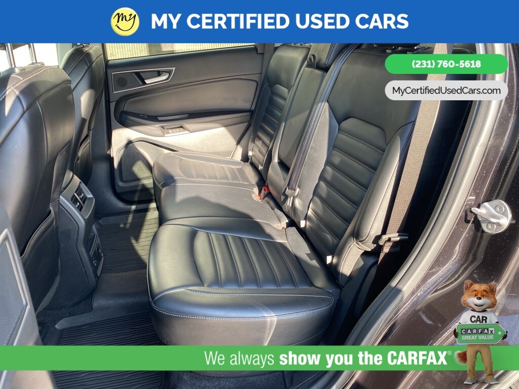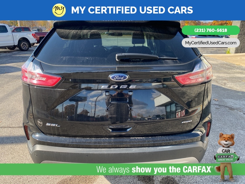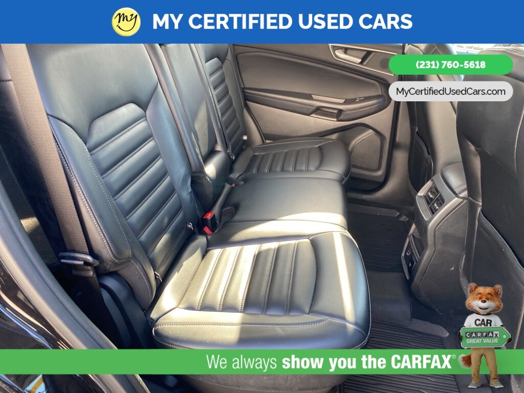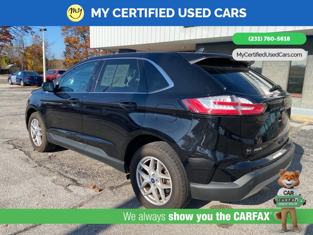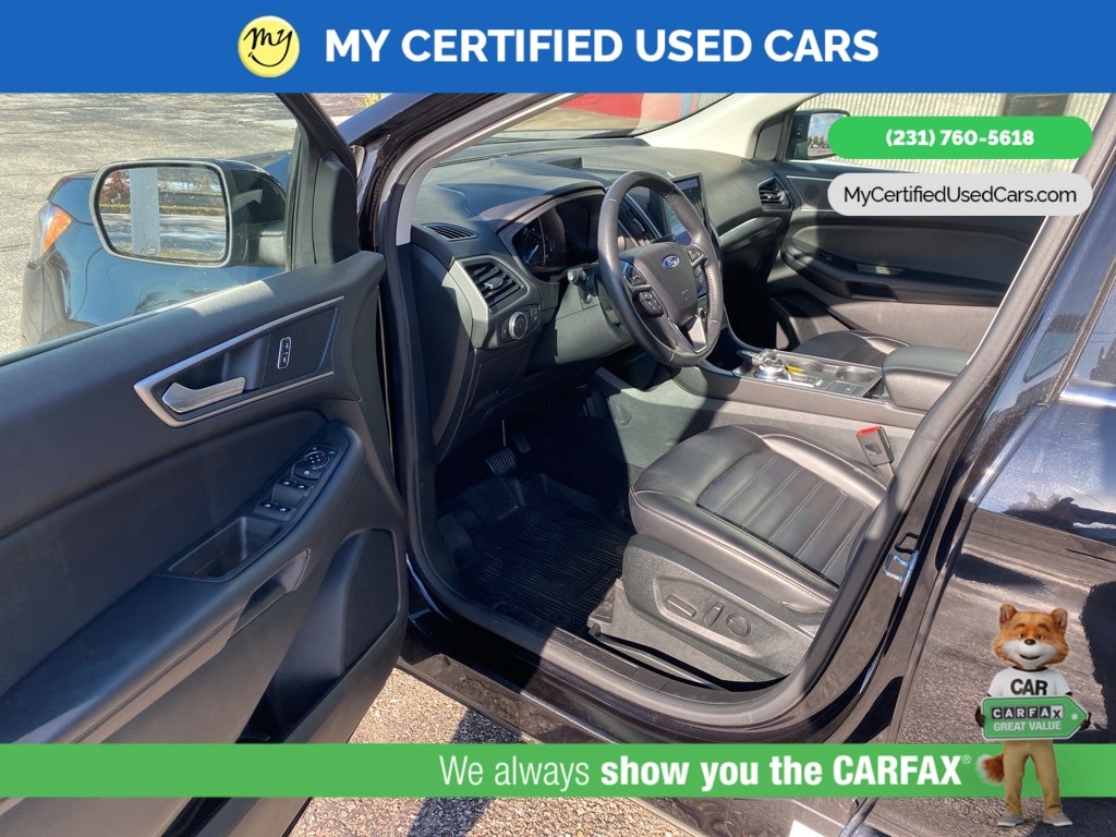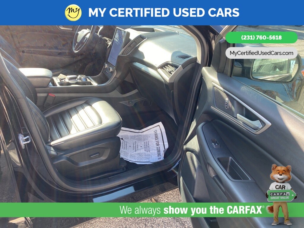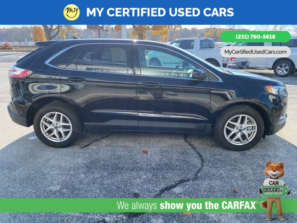 MY Certified Used Cars of Muskegon is your #1 choice in Michigan to get the BEST PRICE on used vehicles and BEST value for your trade. The MY Certified Used Cars team is ready to provide you with a world-class experience, ensuring that you find the perfect vehicle that fits all your needs. Every vehicle has been through a full safety inspection completed by certified technicians and fully detailed. We sell many makes and models, Pre-Owned Vehicles with years from 2025-2024-2023-2022-2021-2020-2019-2018-2017-2016-2015-2014-2013-2012-2011-2010-2009-2008-2007 and all makes Audi, BMW, Chevrolet, Toyota, Volkswagen, Kia, Hyundai, Mercedes, Dodge, Chrysler, Jeep, Ram, Lincoln, Honda, Subaru, and many models like Bronco, Bronco Sport, Edge, Escapes, Expedition, Explorer, Fusions, Focus, Flex, F-150 Series, F-250, F-350, Super Duty Diesel Trucks, Maverick, Mustang MACH-E, Mustang, Ranger, Transit, Wrangler, Grand Cherokee, Grand Cherokee L, Wagoneer, Gladiator, Grand Caravan, RAM, RAM HEMI, and more. Take advantage of our VIP experience by calling 231-760-5618 to schedule a test drive. Read our customer reviews at www.mycertifiedusedcars.com/testimonials or view our entire selection of preowned vehicles at www.mycertifiedusedcars.com, or stop by today, located at 3692 Airline Rd. Muskegon, MI 49444. CARFAX One-Owner. Black Metallic 2022 Ford Edge SEL AWD 8-Speed Automatic EcoBoost 2.0L I4 GTDi DOHC Turbocharged VCT
