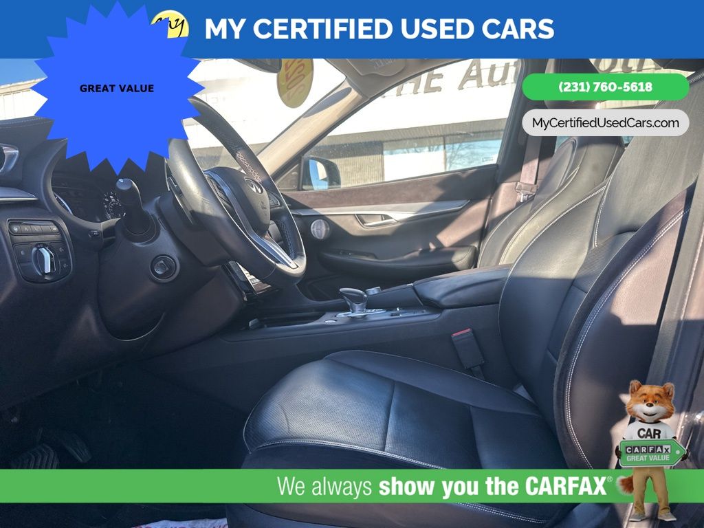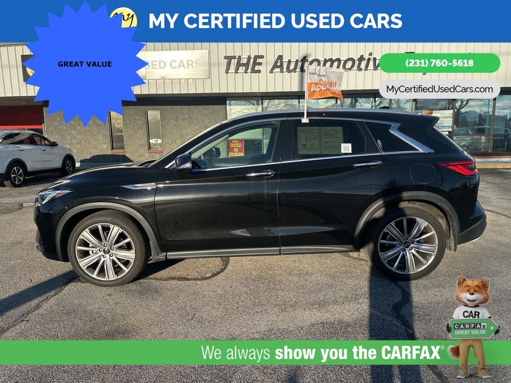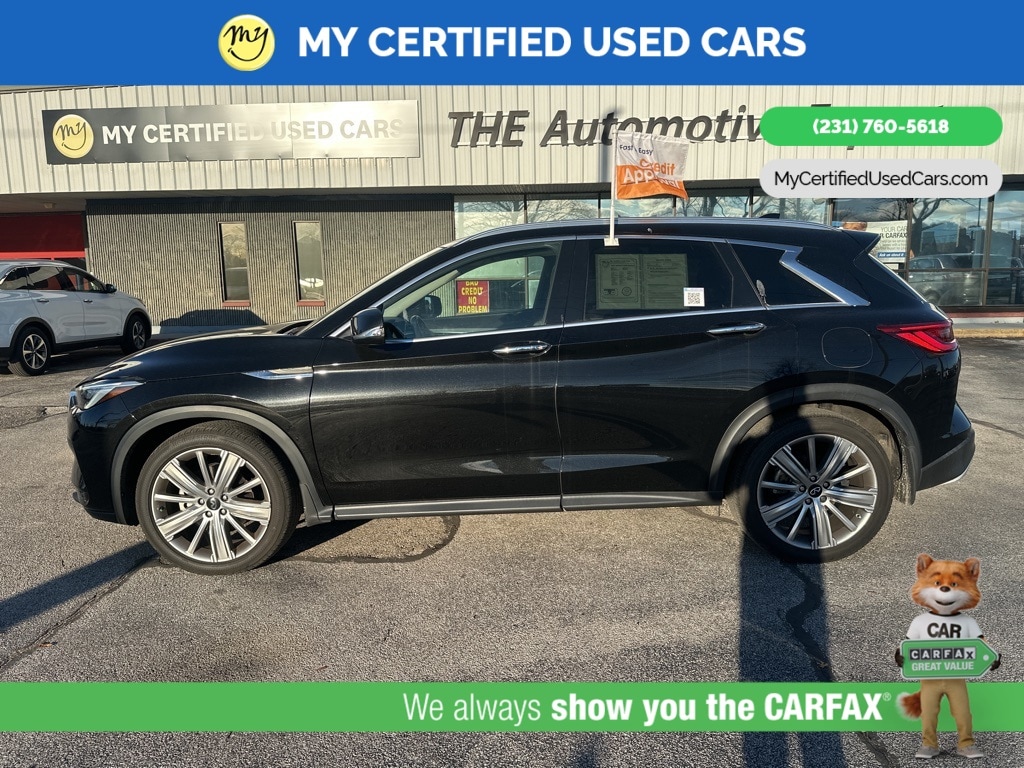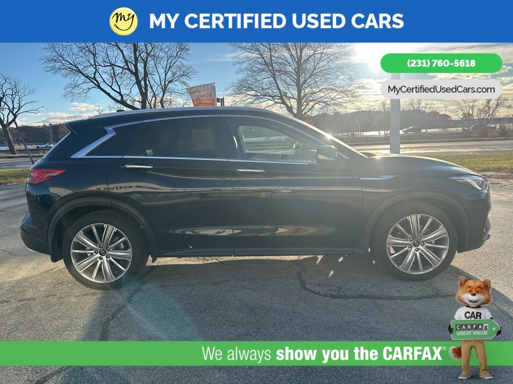 ***This 2022 INFINITI QX50 Sensory is LOADED with OPTIONS (*PANORAMIC MOONROOF*), 4D Sport Utility, AWD, *APPLE CARPLAY & ANDROID AUTO*, *BACKUP CAMERA*, *BACKUP SENSORS*, *HEATED SEATS*, *LEATHER HEATED POWER SEATS*, *NAVIGATION SYSTEM*, *PREMIUM SOUND*, *PREMIUM WHEELS*, *REMOTE START*, *VERY CLEAN*, Heated front seats, Memory seat, Navigation system: INFINITI InTouch Navigation, Power Liftgate, Power moonroof, Radio: Bose Performance Series Audio System, Ventilated front seats, Wheels: 20" Silver Painted Machine Finished. MY Certified Used Cars of Muskegon is your #1 choice in Michigan to get the BEST PRICE on used vehicles and BEST value for your trade. The MY Certified Used Cars team is ready to provide you with a world-class experience, ensuring that you find the perfect vehicle that fits all your needs. Every vehicle has been through a full safety inspection completed by certified technicians and fully detailed. We sell many makes and models, Pre-Owned Vehicles with years from 2025-2024-2023-2022-2021-2020-2019-2018-2017-2016-2015-2014-2013-2012-2011-2010-2009-2008-2007 and all makes Audi, BMW, Chevrolet, Toyota, Volkswagen, Kia, Hyundai, Mercedes, Dodge, Chrysler, Jeep, Ram, Lincoln, Honda, Subaru, and many models like Bronco, Bronco Sport, Edge, Escapes, Expedition, Explorer, Fusions, Focus, Flex, F-150 Series, F-250, F-350, Super Duty Diesel Trucks, Maverick, Mustang MACH-E, Mustang, Ranger, Transit, Wrangler, Grand Cherokee, Grand Cherokee L, Wagoneer, Gladiator, Grand Caravan, RAM, RAM HEMI, and more. Take advantage of our VIP experience by calling 231-760-5618 to schedule a test drive. Read our customer reviews at www.mycertifiedusedcars.com/testimonials or view our entire selection of preowned vehicles at www.mycertifiedusedcars.com, or stop by today, located at 3692 Airline Rd. Muskegon, MI 49444. CARFAX One-Owner. Mineral Black 2022 INFINITI QX50 Sensory AWD CVT I4
