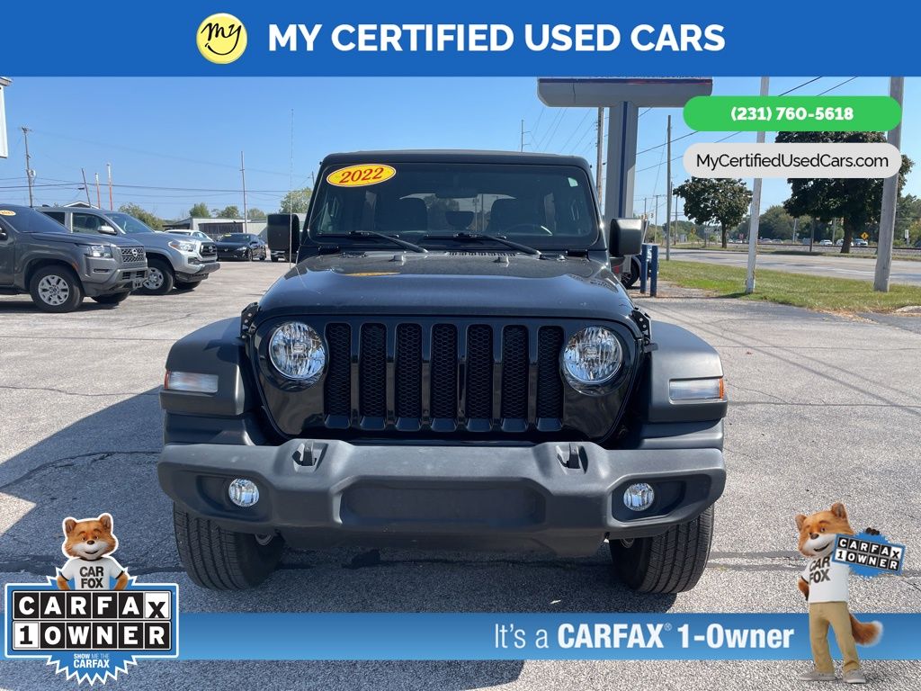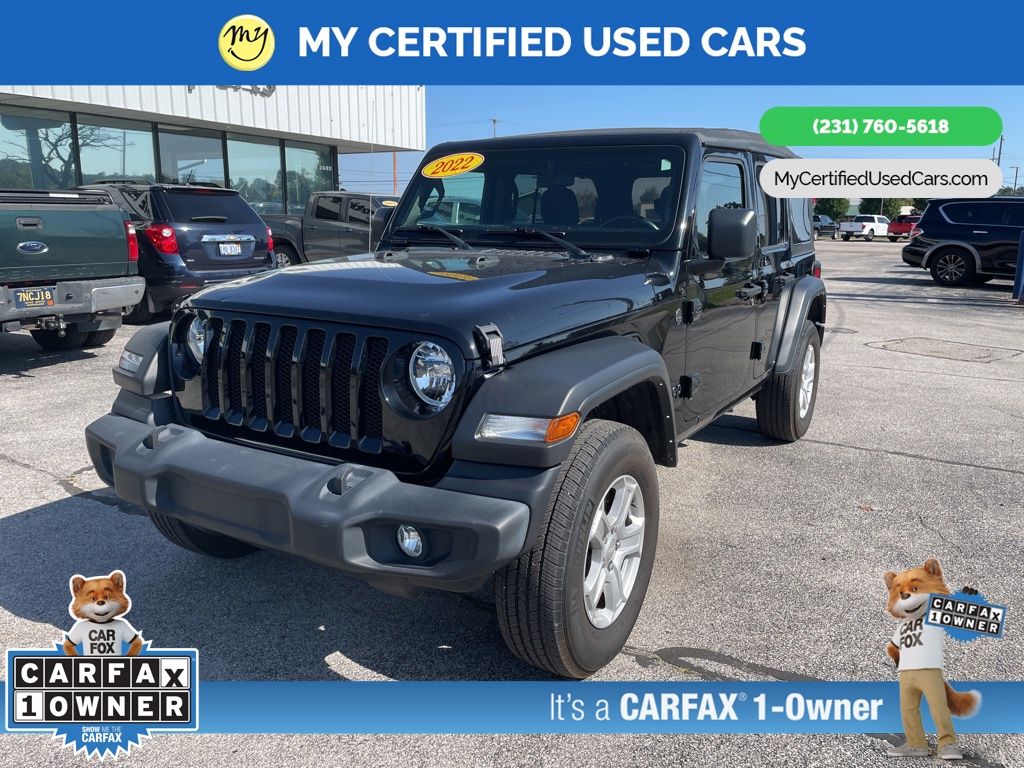 *VERY CLEAN* ***2022 JEEP WRANGLER UNLIMITED SPORT S 4WD***, ***BLACK SUNRIDER SOFT TOP***, *FULLY SERVICED*, *REMOTE START*, *APPLE CARPLAY & ANDROID AUTO*, *REARVIEW CAMERA*, Automatic Headlamps, Convenience Group, Deep Tint Sunscreen Windows, Front 1-Touch Down Power Windows, Leather Wrapped Steering Wheel, Power Heated Mirrors, Quick Order Package 22S Sport S, Remote Keyless Entry, Security Alarm, Speed Sensitive Power Locks, Sport S, Sun Visors w/Illuminated Vanity Mirrors, Universal Garage Door Opener, Wheels: 17" x 7.5" Tech Silver Aluminum. MY Certified Used Cars of Muskegon is your #1 choice in Michigan to get the BEST PRICE on used vehicles and BEST value for your trade. The MY Certified Used Cars team is ready to provide you with a world-class experience, ensuring that you find the perfect vehicle that fits all your needs. Every vehicle has been through a full safety inspection completed by certified technicians and fully detailed. We sell many makes and models, Pre-Owned Vehicles with years from 2025-2024-2023-2022-2021-2020-2019-2018-2017-2016-2015-2014-2013-2012-2011-2010-2009-2008-2007 and all makes Audi, BMW, Chevrolet, Nissan, Toyota, Volkswagen, Kia, Hyundai, Mercedes, Dodge, Chrysler, Jeep, Ram, Lincoln, Honda, Subaru, and many models like Bronco, Bronco Sport, Edge, Escapes, Expedition, Explorer, Fusions, Focus, Flex, F-150 Series, F-250, F-350, Super Duty Diesel Trucks, Maverick, Altima, RAV4, 4 Runner, Mustang, Ranger, Transit, Wrangler, Grand Cherokee, Grand Cherokee L, Wagoneer, Gladiator, Grand Caravan, RAM, RAM HEMI, and more. Take advantage of our VIP experience by calling 231-760-5618 to schedule a test drive. Read our customer reviews at www.mycertifiedusedcars.com/testimonials or view our entire selection of preowned vehicles at www.mycertifiedusedcars.com, or stop by today, located at 3692 Airline Rd. Muskegon, MI 49444. CARFAX One-Owner. Black Clearcoat 2022 Jeep Wrangler Unlimited Sport S 4WD 8-Speed Automatic 2.0L I4 DOHC
