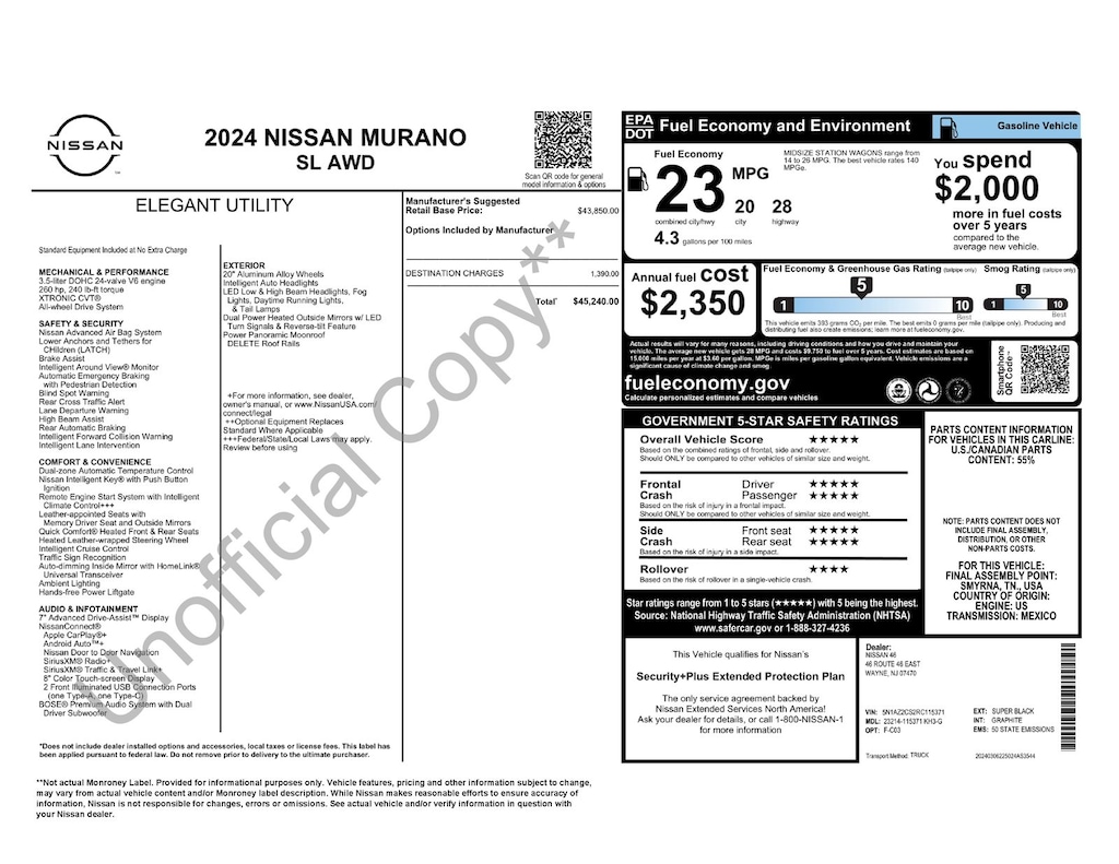 Murano SL, AWD, Super Black, *ALL WHEEL DRIVE*, *APPLE CARPLAY & ANDROID AUTO*, *BLIND SPOT MONITORING*, *HEATED REAR Seats*, *HEATED STEERING WHEEL*, *LANE DEPARTURE WARNING*, *LEATHER HEATED POWER SEATS*, *LOCAL TRADE*, *OIL CHANGES for LIFE*, *PANORAMIC MOONROOF*, *REARVIEW CAMERA*. Super Black 2024 Nissan Murano SL AWD CVT with Xtronic 3.5L V6 DOHC 24V