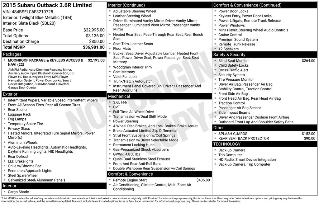 Outback 3.6R Limited, Twilight Blue Metallic, *ALL WHEEL DRIVE*, *BACKUP CAMERA*, *BLIND SPOT MONITORING*, *HEATED REAR Seats*, *LEATHER HEATED POWER SEATS*, *MOONROOF*, Auto-Dimming Rear View Compass Mirror w/Homelink, harman/kardon Surround Sound Speaker System, Moonroof Package & Keyless Access & Navi, Power Moonroof Package, Radio: AM/FM Stereo HD Radio & Navigation System, Rear-Vision Camera, Vehicle Information Display. Twilight Blue Metallic 2015 Subaru Outback 3.6R Limited AWD CVT Lineartronic 3.6L Boxer H6 DOHC 24V