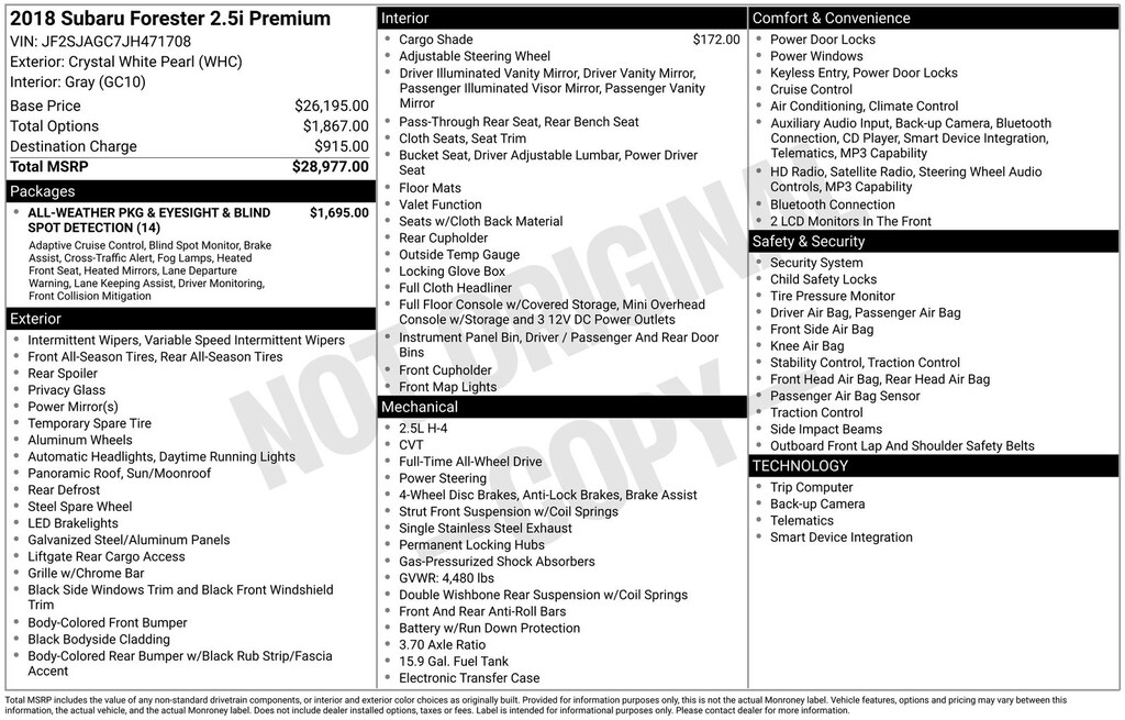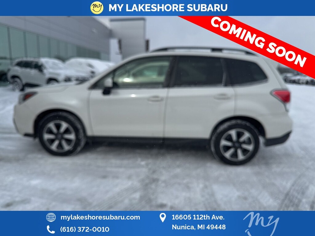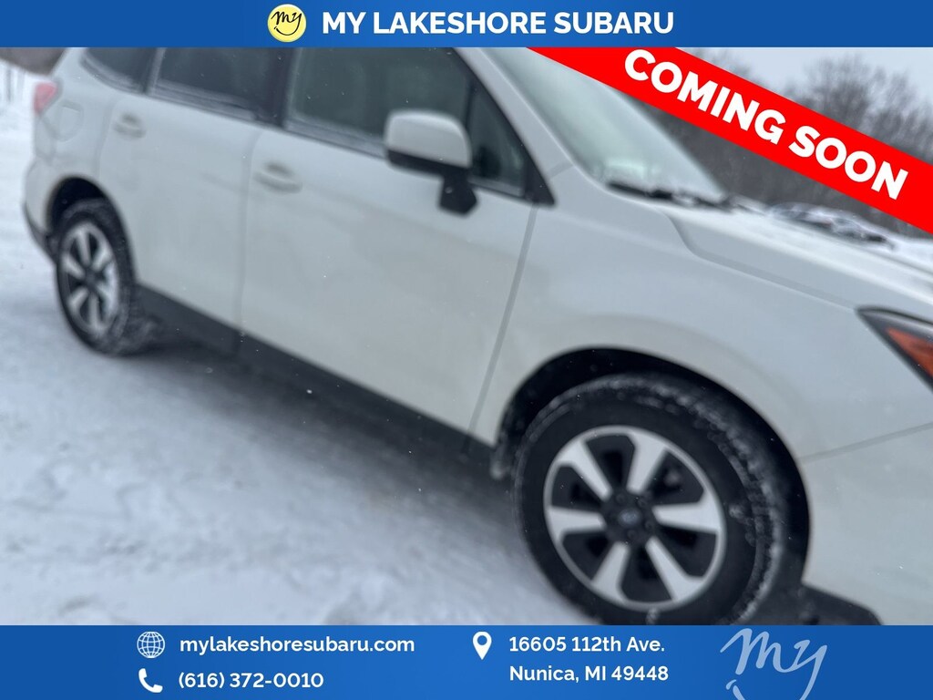 Forester 2.5i Premium, Crystal White Pearl, *ALL WHEEL DRIVE*, *BLIND SPOT ALERT*, *EYESIGHT Driver Assist*, *HEATED SEATS*, *LANE DEPARTURE WARNING*, *LOCAL TRADE*, *PANORAMIC MOONROOF*, All-Weather Pkg & EyeSight & Blind Spot Detection, Blind Spot Detection w/Rear Cross Traffic Alert, EyeSight System, Heated Exterior Mirrors, Heated Front Seats, High Grade Instrument Cluster w/Color LCD Display, Steering Responsive Fog Lights (SRF), Windshield Wiper De-Icer. Crystal White Pearl 2018 Subaru Forester 2.5i Premium AWD Lineartronic CVT 2.5L 4-Cylinder DOHC 16V VVT