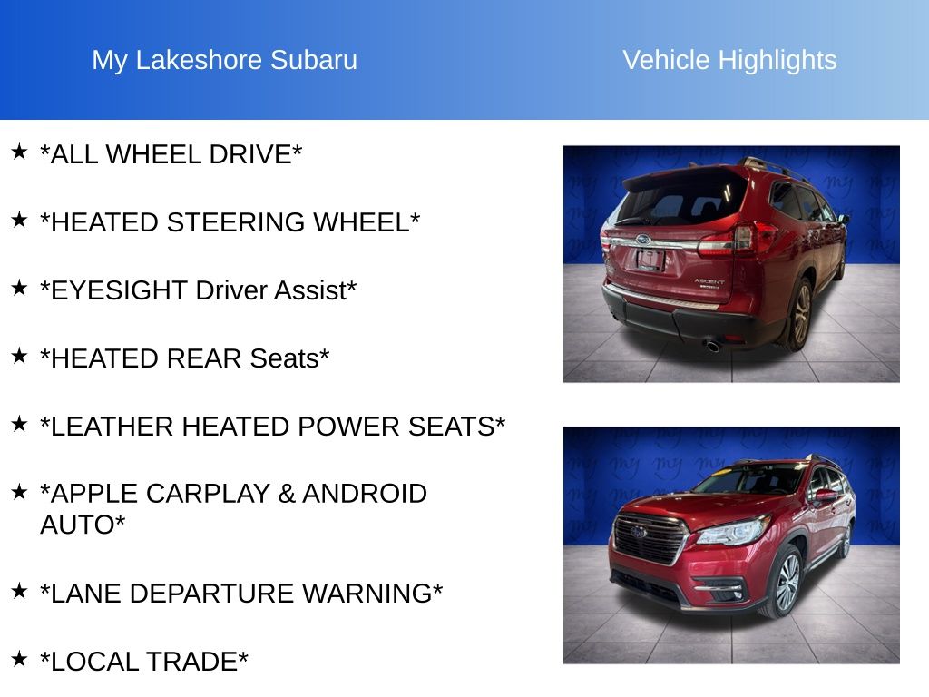 Ascent Limited, AWD, *ALL WHEEL DRIVE*, *APPLE CARPLAY & ANDROID AUTO*, *EYESIGHT Driver Assist*, *HEATED REAR Seats*, *HEATED STEERING WHEEL*, *LANE DEPARTURE WARNING*, *LEATHER HEATED POWER SEATS*, *LOCAL TRADE*. Crimson Red Pearl 2019 Subaru Ascent Limited AWD Lineartronic CVT 2.4L DOHC