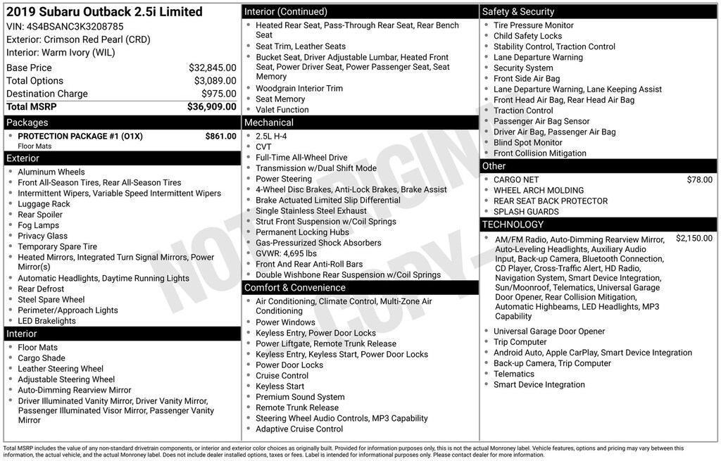 Crd 2019 Subaru Outback 2.5i Limited AWD CVT Lineartronic 2.5L 4-Cylinder DOHC 16V