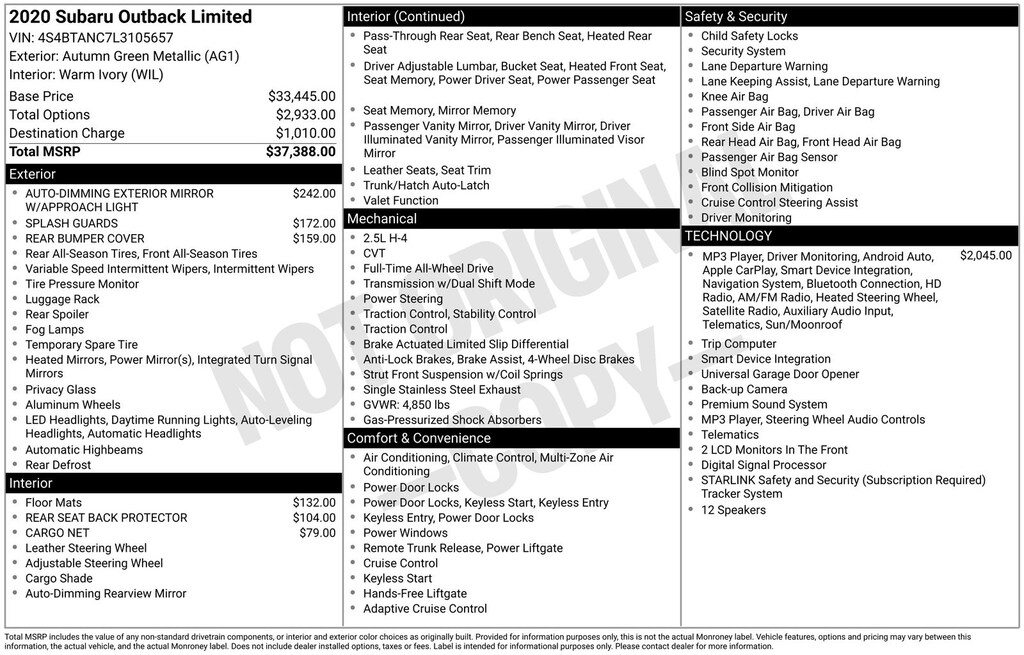 Outback Limited, Autumn Green Metallic, *ALL WHEEL DRIVE*, *APPLE CARPLAY & ANDROID AUTO*, *BACKUP CAMERA*, *BLIND SPOT MONITORING*, *EYESIGHT Driver Assist*, *LANE DEPARTURE WARNING*, *LEATHER HEATED POWER SEATS*, *LOCAL TRADE*, *MOONROOF*, *OIL CHANGES for LIFE*, Driver Focus (Distraction Mitigation System), harman/kardon Surround Sound Speaker System, Heated Steering Wheel, Power Moonroof, Power Moonroof & HSW & Navigation System, Radio: Subaru STARLINK 11.6" Multimedia Nav System. Autumn Green Metallic 2020 Subaru Outback Limited AWD CVT Lineartronic 2.5L 4-Cylinder DOHC 16V