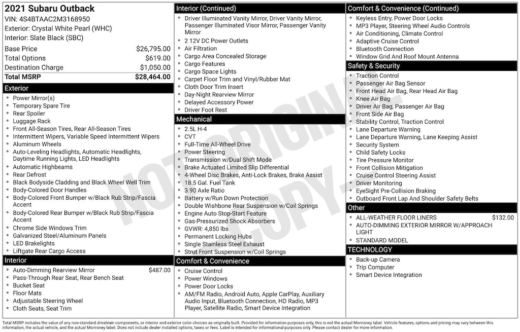Outback 2.5i, AWD, Crystal White Pearl, *ALL WHEEL DRIVE*, *APPLE CARPLAY & ANDROID AUTO*, *EYESIGHT Driver Assist*, *LANE DEPARTURE WARNING*, *LOCAL TRADE*, *OIL CHANGES for LIFE*. Crystal White Pearl 2021 Subaru Outback 2.5i AWD CVT Lineartronic 2.5L 4-Cylinder DOHC 16V