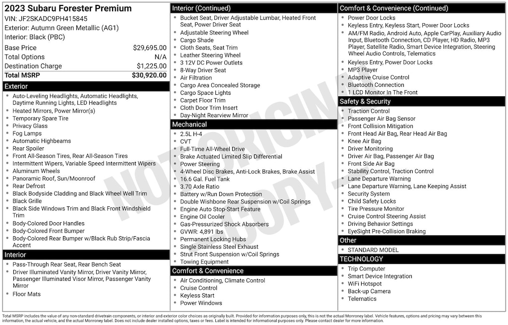 Forester Premium, Autumn Green Metallic, *ALL WHEEL DRIVE*, *APPLE CARPLAY & ANDROID AUTO*, *EYESIGHT Driver Assist*, *HEATED SEATS*, *LANE DEPARTURE WARNING*, *OIL CHANGES for LIFE*, *PANORAMIC MOONROOF*. Certified. Autumn Green Metallic 2023 Subaru Forester Premium AWD Lineartronic CVT 2.5L 4-Cylinder DOHC 16V