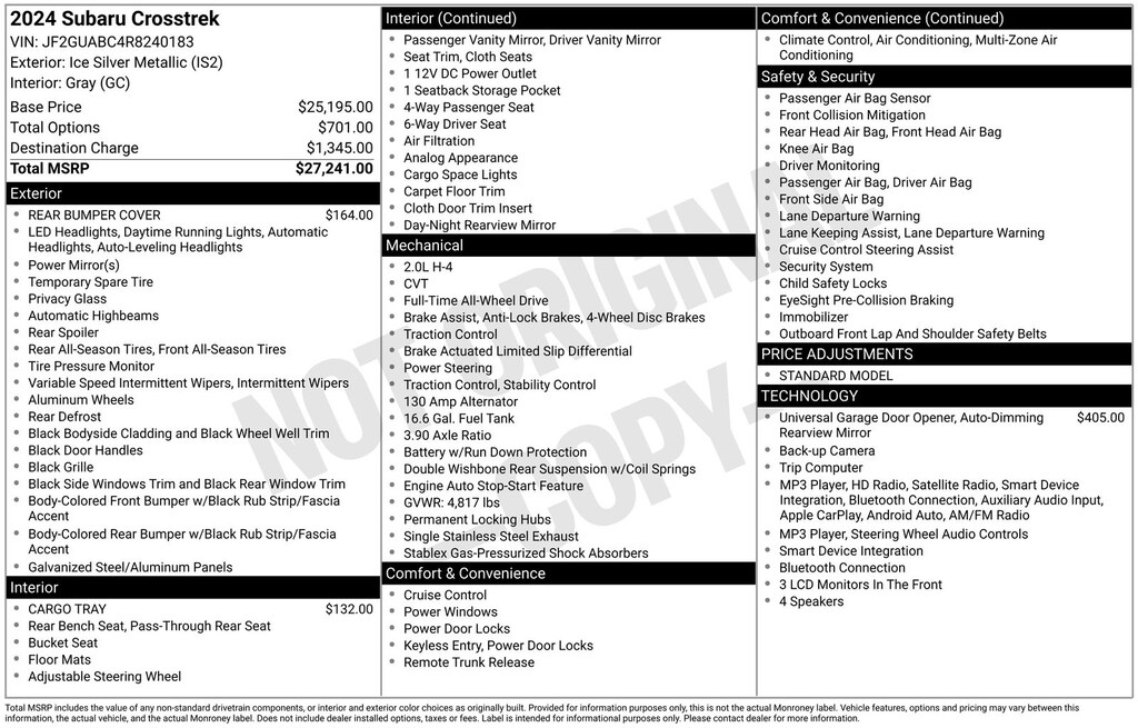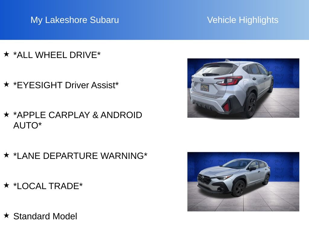 Ice Silver Metallic, *ALL WHEEL DRIVE*, *APPLE CARPLAY & ANDROID AUTO*, *EYESIGHT Driver Assist*, *LANE DEPARTURE WARNING*, *LOCAL TRADE*, Standard Model. Ice Silver Metallic 2024 Subaru Crosstrek AWD Lineartronic CVT 2.0L 4-Cylinder DOHC 16V